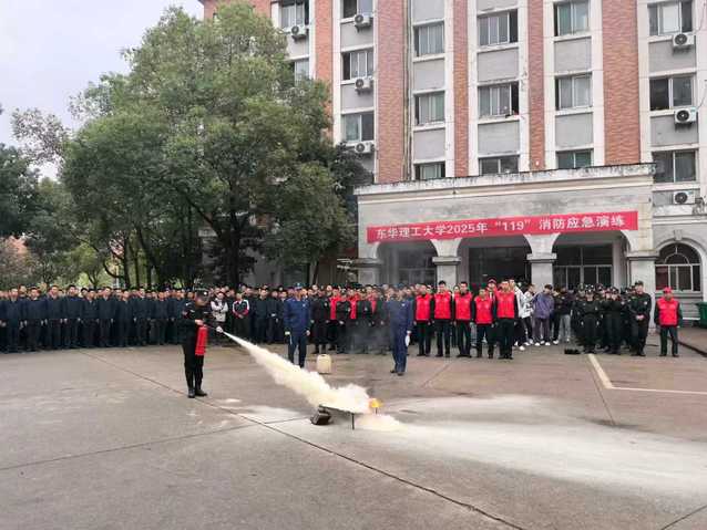 抚州校区管委会、保卫处、国防教育学院、驻抚州校区各学院2025级学生代表、东华科技园公司和后勤保障处饮食服务中心员工共计500余人参加了消防演练活动。