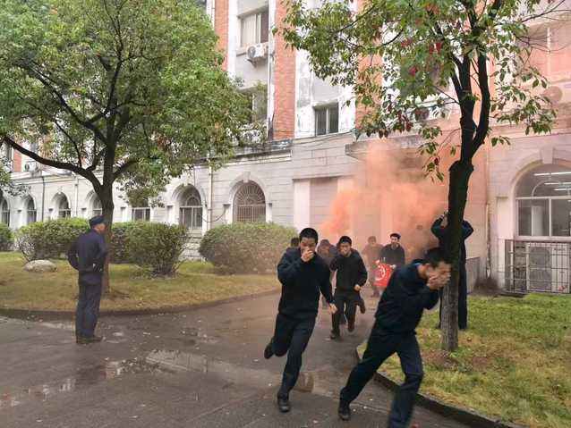 工作人员在玉茗校园学生公寓3号楼引燃烟雾弹,“无脚本”疏散应急演练开始。物业宿管员迅速启动应急预案,拨打“119”火警电话,向校保卫处报告火情,各楼层学生手捂口鼻低姿态从消防通道安全出口紧急疏散至一层室外,工作人员进入各个楼层引导和搜寻未撤离学生疏散。整个过程快速有序,有效检验了消防应急预案。