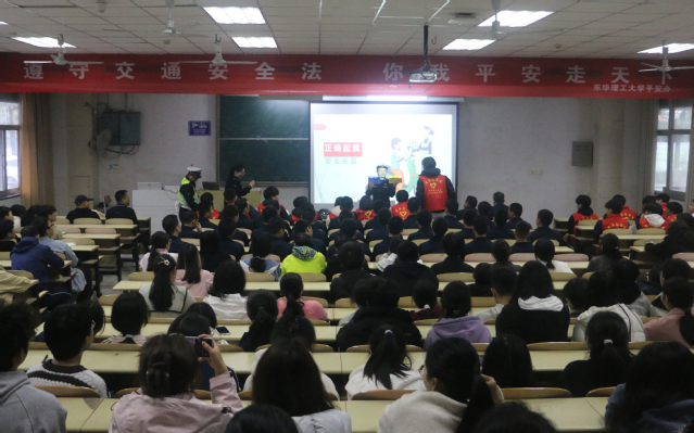 为增强师生交通安全防护意识,筑牢校园安全防线, 3月31日,东华理工大学保卫处邀请抚州市交管支队临川一大队副大队长周琴臻、主管宣传工作的刘英警官、一片区中队长李新建等一行6人,在学府校园开展以“遵守交通安全法,你我平安走天下”为主题的交通安全知识讲座。